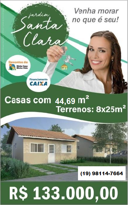 Residencial Jardim Santa Clara. Casas de 44, 69 m² em lotes de 200 m². O morador terá uma residência com Sala - agora você pode decorar aquele espaço de reunião familiar do jeito que você gosta. 2 Quartos e 1 Banheiro, adequados para atender as típicas famílias brasileiras. Cozinha - as refeições das famílias serão mais divertidas no espaço projetado, Lavanderia e Quintal. Espaço para 2 carros na garagem. E para ficar ainda melhor, as famílias não terão dores de cabeça em relação à infraestrutura do local. Sabemos que é estressante ter problemas com água, coleta de esgoto, pavimentação. Energia elétrica, guias e sarjetas e iluminação pública, prontos. Escolas, Posto de Saúde, Creche etc. A infraestrutura é completa e pronta para receber vocês. E melhor, Sem Condomínio à pagar.
